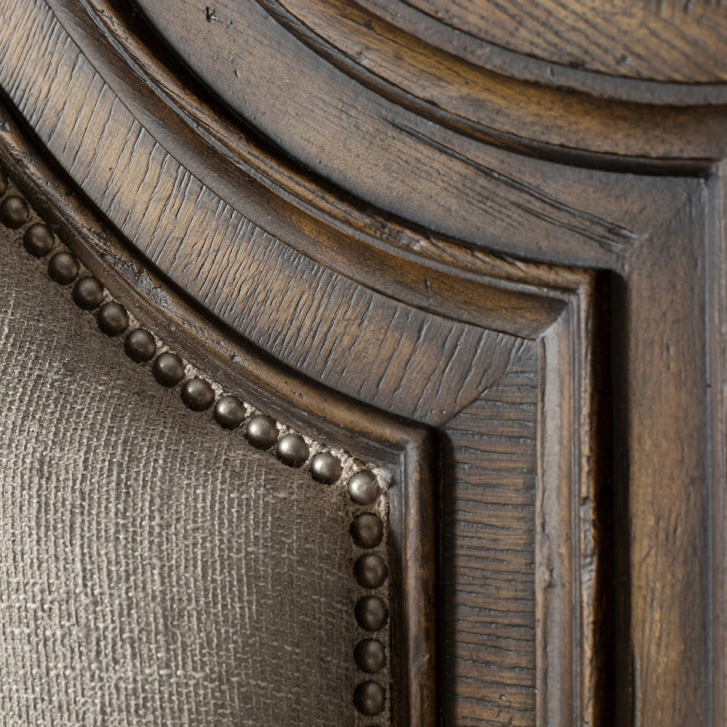 Crafted with meticulous attention to detail, this bed features an exquisite button-tufted upholstered design, set against an elaborately carved and shaped headboard and footboard. The fusion of an aged black finish at the heart of the footboard and a timeworn saddle brown on the headboard and footboard’s carved border exudes a vintage charm.