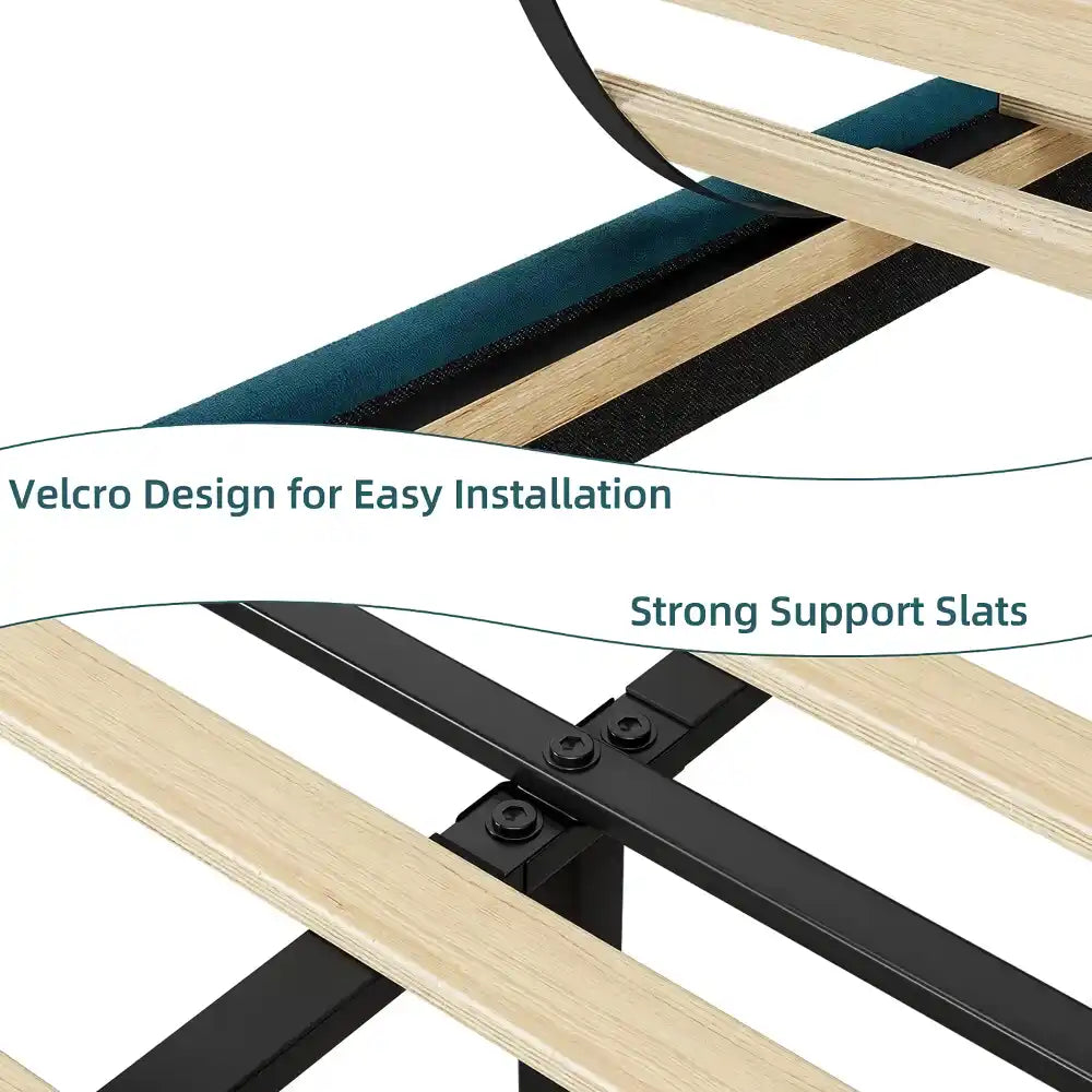 Experience the ultimate in customization and comfort with our adjustable headboard. Offering three height settings, it caters to your unique comfort needs, whether you enjoy reading in bed or watching TV. The plush upholstered headboard, measuring 76.4″L x 81.9″W x 42.5″H, is not just a statement of style but also a promise of comfort. Our bed frame’s sleek, modern design, accentuated by its stunning blue color and wood finish, effortlessly complements any bedroom decor. Its appearance embodies modern style, Scandinavian simplicity, and a hint of modern Morocco, making it a versatile addition to any interior design theme.
