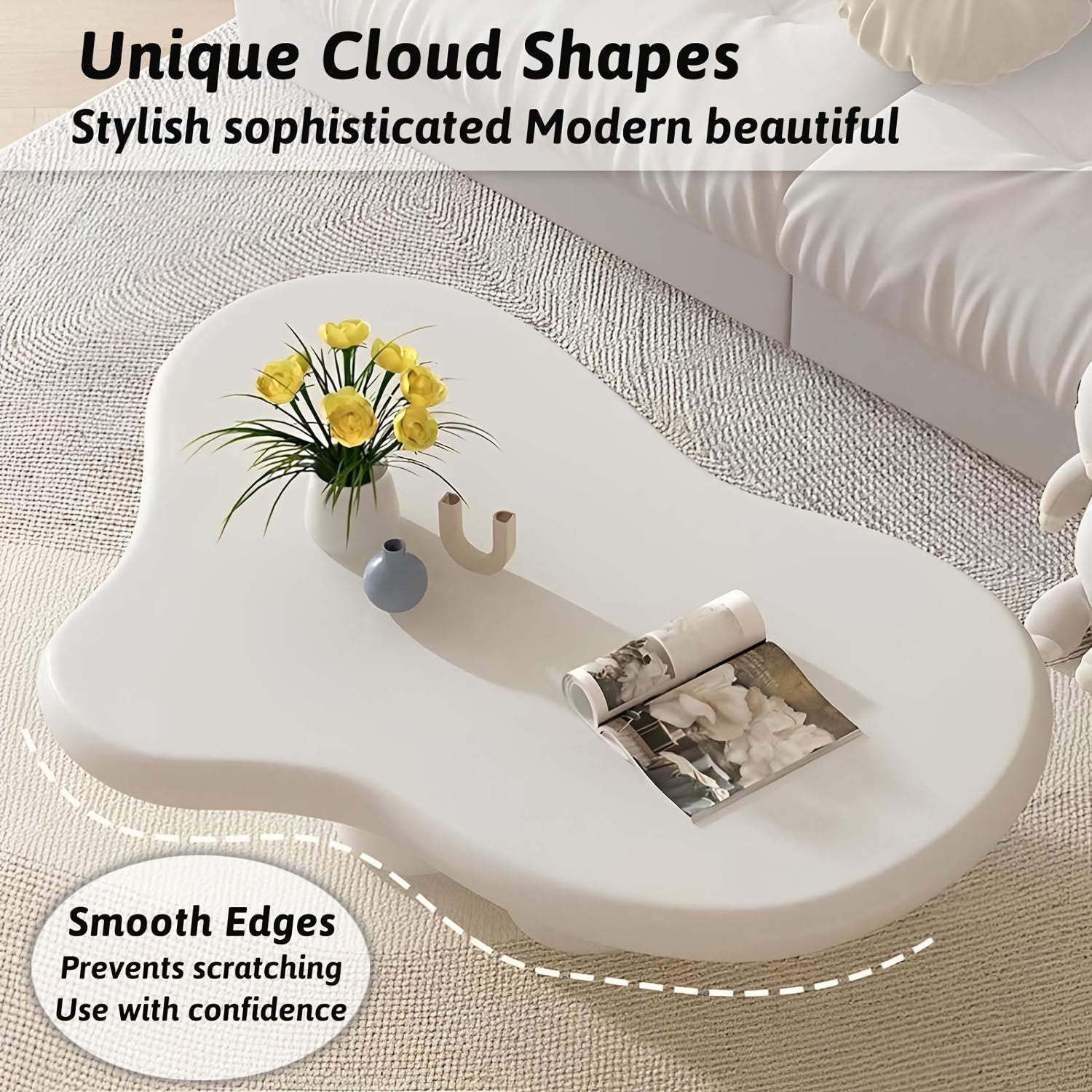 Introducing our Modern Minimalist Cloud-Shaped Coffee Table – a perfect blend of style and functionality, designed to elevate the aesthetic of any room. Its unique cloud shape and classic ivory white color make it a captivating centerpiece for your living room, bedroom, or office space. Crafted with a keen eye for detail, this table is more than just a piece of furniture; it’s a statement of elegance and modernity.