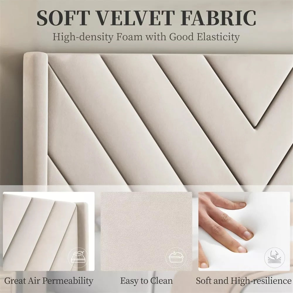 Transform your bedroom into a restful retreat with this Modern Velvet Upholstered Queen Platform Bed. Designed for those who appreciate both comfort and style, this bed features a tall, tufted headboard with graceful wing sides, adding a refined and cozy touch to your space. The soft velvet fabric paired with plush foam padding creates the perfect backdrop for late-night reading or lounging, while the clean light gray tone effortlessly complements any modern décor.