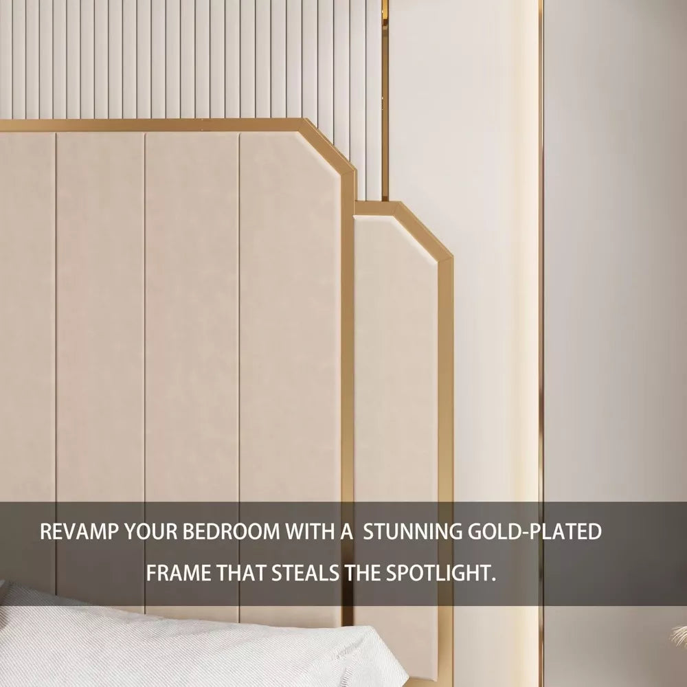 Transform your bedroom into a haven of style and practicality with this queen-sized upholstered bed frame, designed exclusively for Samsung-inspired homes. Combining plush velvet fabric with sleek gold accents, this bed frame is the epitome of modern luxury. Its tall 59-inch headboard creates a stunning focal point, while the storage-friendly design offers seamless functionality. Perfect for anyone who desires both elegance and efficiency in their space.