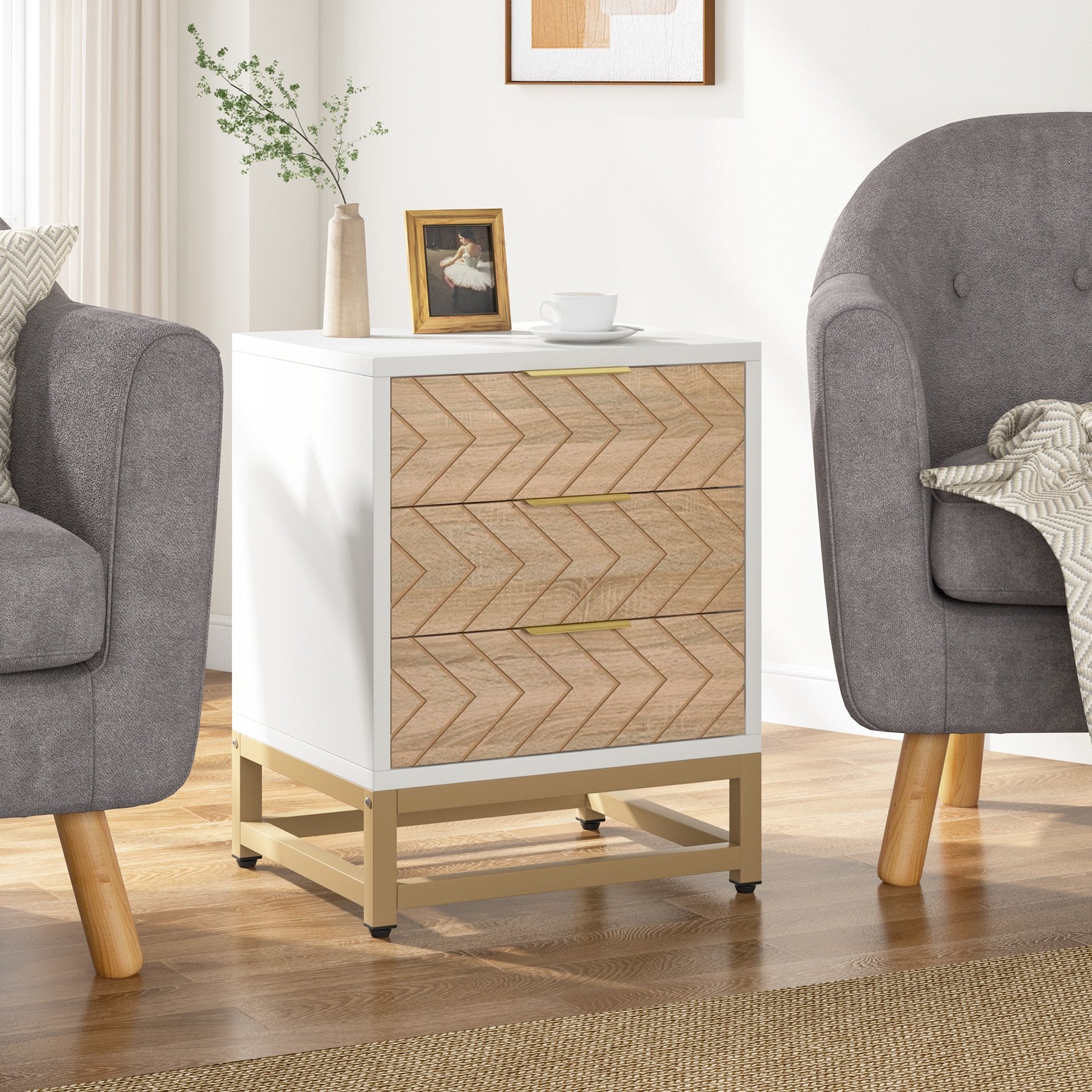 Bring a touch of modern charm to your home with this stunning set of two 3-drawer nightstands. Designed to elevate your bedroom décor, these bedside tables feature a beautiful contrast of warm wood tones and sleek white chevron-patterned panels. Their elegant design, complete with golden handles and metal legs, effortlessly blends modern and Scandinavian styles, creating a cozy yet sophisticated atmosphere in any room.