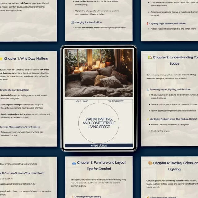 Unlike generic decor guides, this ebook focuses on comfort first, not perfection. It blends practical design principles with emotional warmth and introduces AI as a modern, accessible tool to help you visualize and refine your space over time.